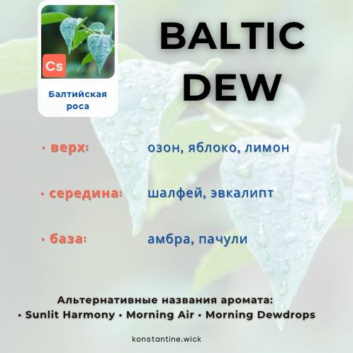 Ароматическое масло Балтийская роса передает ощущение туманного пейзажа на рассвете. Бодрящие, чистые верхние ноты озона, зеленого яблока и лимона пронизывают утренний воздух, в то время как средние ноты травяного шалфея и успокаивающего эвкалипта намекают на скрытую глубину. В базе теплая амбра и пачули воссоздают утреннюю росу.