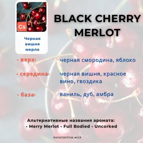 Примечание: Черная вишня Мерло слишком концентрирована во флаконе, чтобы ноты аромата были сбалансированы. Поэтому его следует оценивать только в свечах или средствах личной гигиены.
