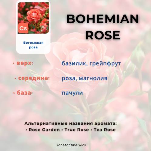 Цветочный аромат Богемская роза раскрывает аромат целой розы: от лепестков до стебля. Верхние ноты базилика и грейпфрута раскрывают ее зелень, а затем перетекают в сильные средние ноты розы с оттенком цветущей магнолии. Сладкий и землистый пачули завершает этот бутиковый аромат розы. Идеально подходит для роскошных средств для ванны и тела, мы рекомендуем Bohemian Rose для мыла, скрабов и лосьонов. Этот аромат позволит создать элегантные свечи и wax melts. Он также одобрен для использования в диффузорах.