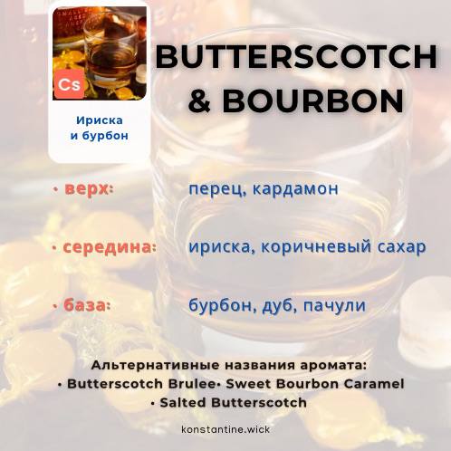 Насыщенное и липко-сладкое с небольшим количеством алкогольного бурбона, ароматическое масло Butterscotch and Bourbon — идеальный способ наслаждаться ним круглый год. Средние ноты сладкого ириски и коричневого сахара прядятся с верхними нотами перца и тёплого кардамона, чтобы вызвать воспоминания о домашних золотистых кондитерах. У основания нотки выдержанного бурбона добавляют тепло, а дуб и дымчатый пачули усиливают насыщенность этого аппетитного аромата.