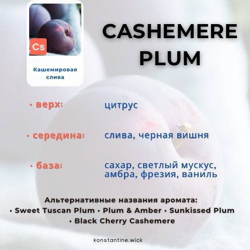 Независимо от того, используется ли он для создания ароматических свечей и диффузоров или восхитительных средств по уходу за телом, этот аромат имеет множество возможностей. С небольшой настройкой вашего лейбла или простой сменой названия Кашемировая Слива (Cashmere Plum) превращается из осенне-праздничного аромата в весенне-летний аромат.
