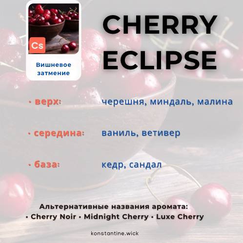 Вдохновленный тонкими ароматами, Cherry Eclipse привносит атмосферу таинственности в свечи, воск и рум-спреи, а также чувственность в мыло, лосьоны и твердые духи.