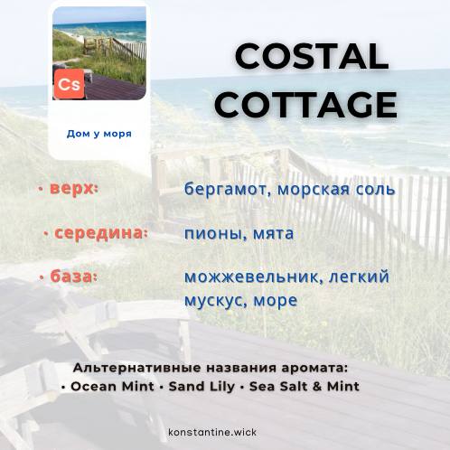Пляжный оазис, где спокойные приливы омывают ваши чувства, — ароматическое масло Дом у моря является воплощением элегантности. Освежающие верхние ноты бергамота и морской соли приглашают вас в сердце из мяты и пиона. Можжевельник, легкий мускус и водянистые морские ноты закрепляют этот успокаивающий, атмосферный аромат. Создавайте высококлассные и атмосферные свечи, wax melts и диффузоры с ароматом Coastal Cottage. И из этого хорошо сбалансированного спа-аромата также получаются прекрасные мыло, лосьоны и скрабы. Этот аромат наполнен натуральными эфирными маслами лимона, мяты и лайма.