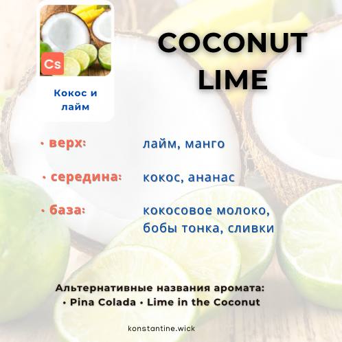 Если вам нравится Пина-Колада, вам понравится этот сливочный цитрусовый аромат. Ароматическое масло Кокоса и лайма является идеальным летним освежающим ароматом и передает ощущение пребывания на тропическом острове с охлажденным напитком в руке. Мы слегка улучшили этот аромат, сбалансировали ноты лайма и кокоса и добавили дополнительный всплеск сливок. Идеально подходящий для летней линии свечей, восковых расплавов и пирогов, этот аромат также привносит атмосферу тропического острова в мыло, лосьоны и скрабы.