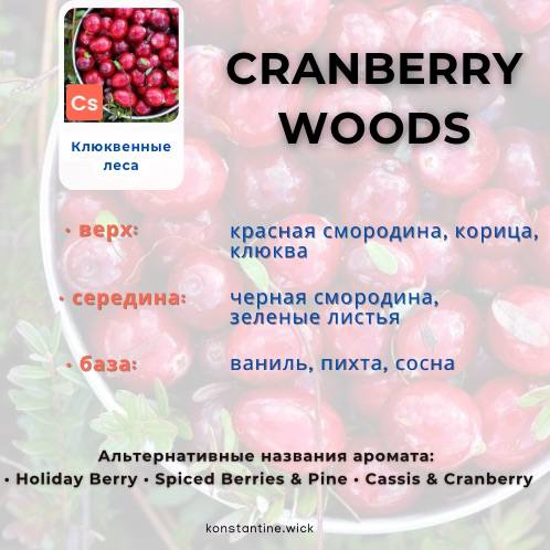 Ароматическое масло Клюквенные леса сочетает в себе терпкость клюквы и смородины с приятными травянистыми аккордами. Этот аромат начинается с нот красной смородины и клюквы, подкрепленных пряной корицей. Сердце из сладкой черной смородины и хрустящих зеленых листьев добавляет свежести и глубины. Ваниль завершает базу сливочной сладостью, а пихта и сосна добавляют ароматную, землистую интригу.