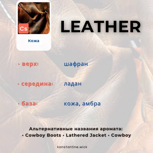 Яркое, богатое и чувственное, ароматическое масло Leather воплощает в себе теплый и роскошный аромат тонкой кожи. Мягкие и землистые верхние ноты шафрана наслаиваются на нежные ноты ладана, и все это опирается на богатую базу из кожи и теплой амбры.