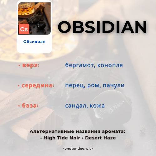 Грани сладости, специй, дерева и дыма убедительно сочетаются в аромате, который не поддается простому описанию. С характерными нотами аромата, такими как перец, конопля и ром, обсидиан одновременно смелый и утонченный, и источает таинственность благодаря своему незабываемому аромату.