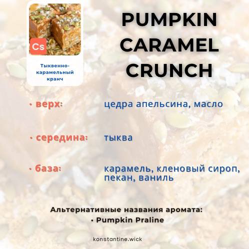 Один из самых аппетитных ароматов осени, ароматическое масло Pumpkin Caramel Crunch начинается с нот сливочного масла и апельсиновой цедры, а затем смешивается в аккордах восхитительной карамели, клена и тыквы. Ореховый, пекановый аромат, этот гурманский аромат лучше всего подходит для осенних свечных линеек среднего ценового сегмента, наполнит любое пространство восхитительными ароматами сезона.