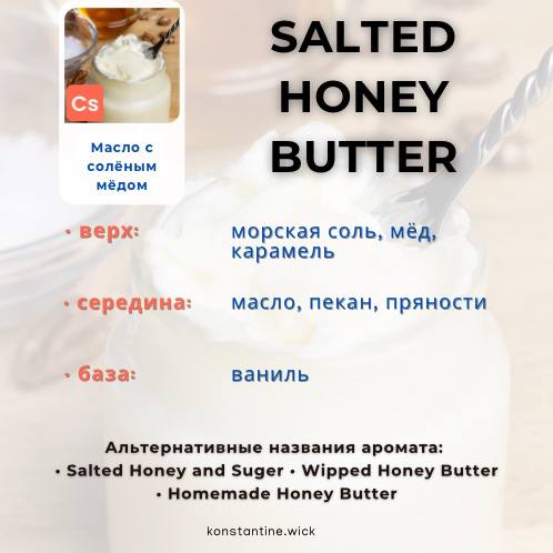 Ароматическое масло Salted Honey Butter представляет собой привлекательную смесь сладкого, соленого и пряного наслаждения. Верхние ноты золотистого меда, морской соли и насыщенной карамели задают восхитительный тон, переходя в сердце из взбитого масла, специй и поджаренного пекана. Гладкая ванильная база неотразимо обволакивает этот аромат.