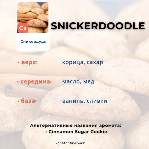 Вкусное лакомство с характерной потрескавшейся поверхностью и вкусом корицы и сахара, печенье Snickerdoodle является круглогодичной классикой. В соответствии с сердцем этих легких и вкусных ингредиентов, ароматическое масло Snickerdoodle имеет ноты сахара, корицы, меда и масла, дополненные гладкой базой из сливочной ванили. Мы рекомендуем создавать с этим ароматом свечи, wax melts или восхитительные линии мыла, лосьонов и скрабов.