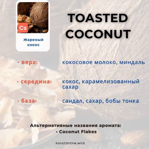 Toasted Coconut — это мощное сочетание кокосового молока и кокоса с тонкими нотками карамелизированного сахара, тонки и сандалового дерева для идеального поджаривания. Отличный самостоятельный ароматизатор или блендер, этот сладкий и сливочный аромат хорошо подходит для свечей, восковых расплавов и пирогов. Или добавьте атмосферу тропического острова в свои ванны и творения для тела, такие как мыло, лосьоны или скрабы.