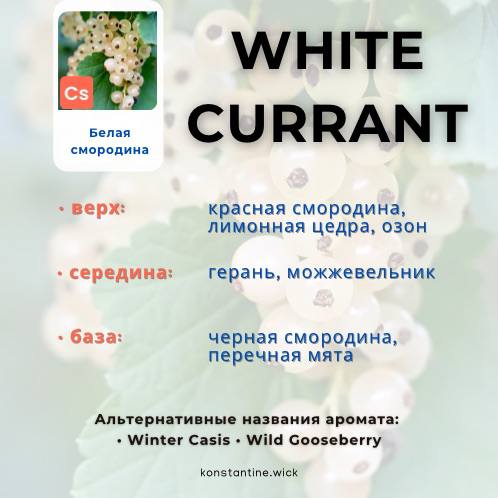 Ароматное масло белой смородины — универсальный аромат с широкой привлекательностью благодаря соблазнительному балансу кислинки и сладости. Красная смородина и острота лимонной цедры сочетаются с воздушным озоном, уступая место ботаническому сердцу из можжевельника и герани. Чёрная смородина и лёгкий оттенок мяты в базе подчёркивают кислую свежесть этого круглогодичного аромата. Белая смородина — идеальный аромат для создания современных, модных домашних ароматов, таких как элегантные свечи и мелтс. Не забывайте об этом аромате и для продуктов для ванны и тела — сочетание кислого и сладкого прекрасно сочетается в ремесленном мыле, маслах для тела и лосьонах.